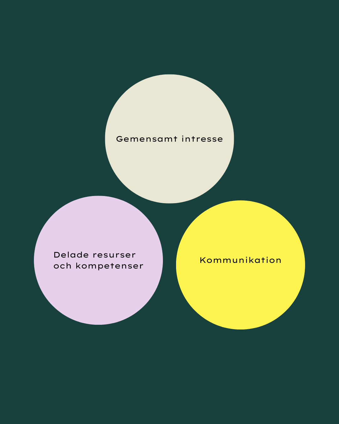 När Mia Ingman analyserade både enkäten och intervjuerna med de olika aktörerna – från både stora och små organisationer – utkristalliserade sig tre avgörande faktorer för att samarbete ska uppstå och hålla över tid.