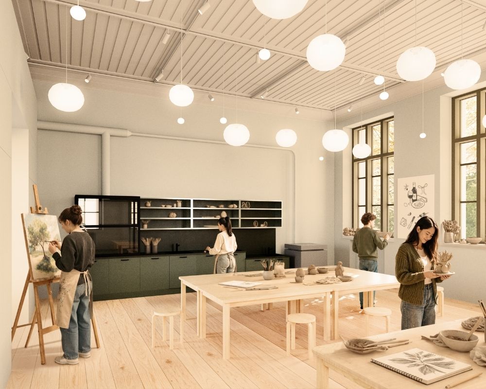 Utrustning: Grafikpress, keramikugn, dragskåp och stafflier.