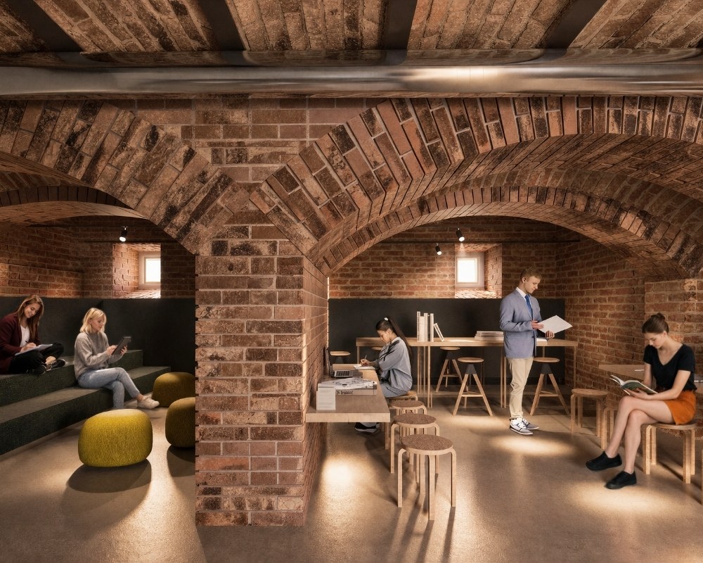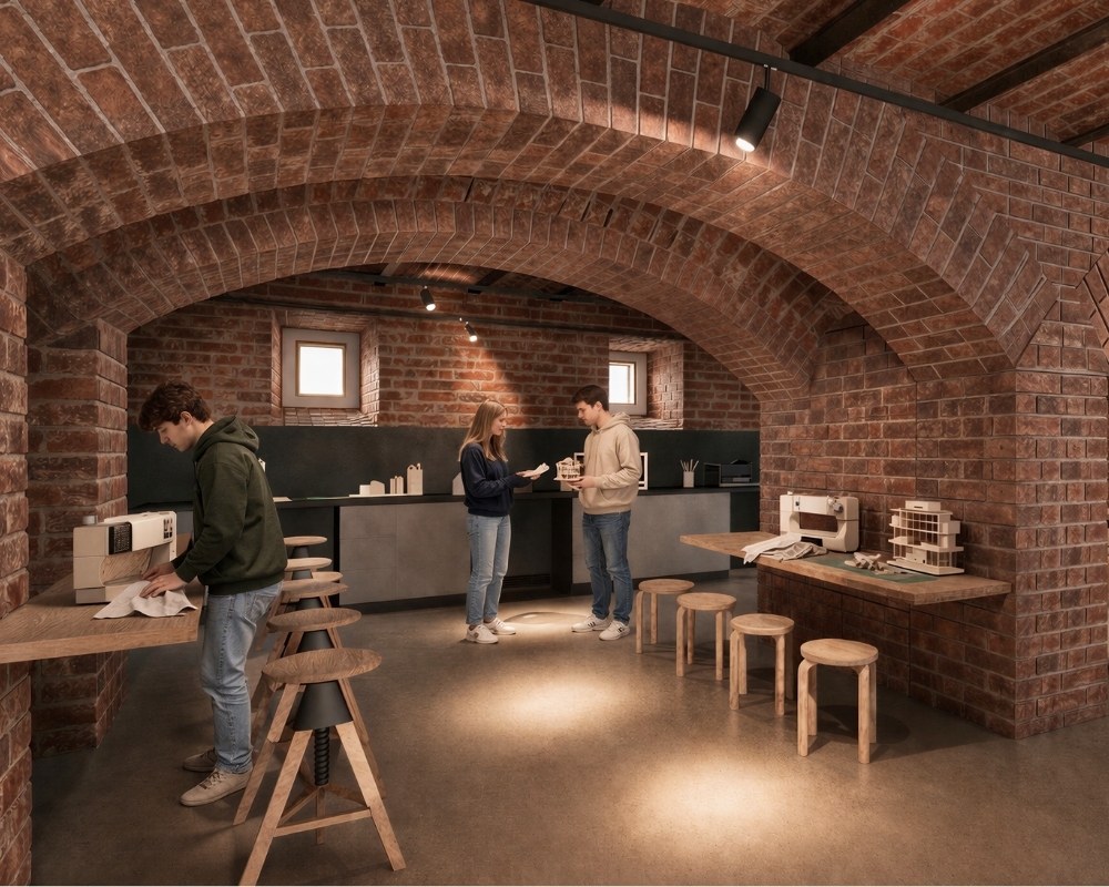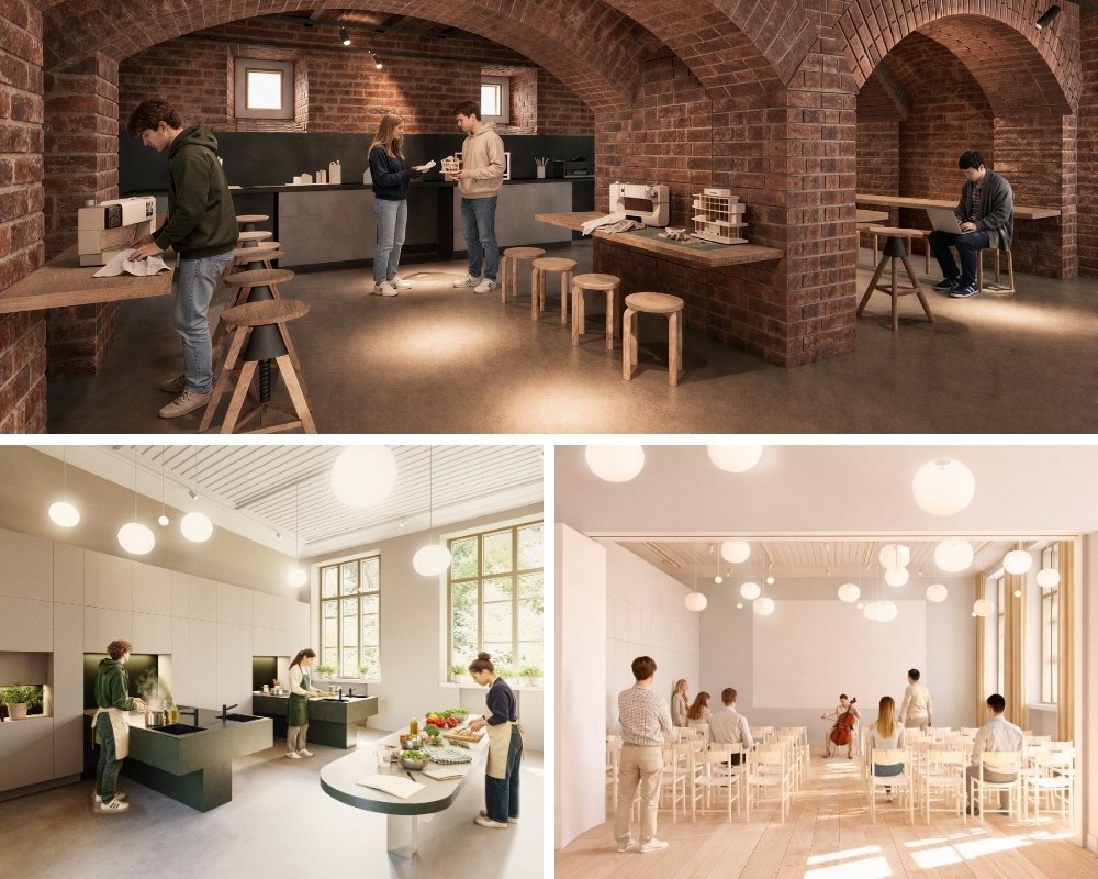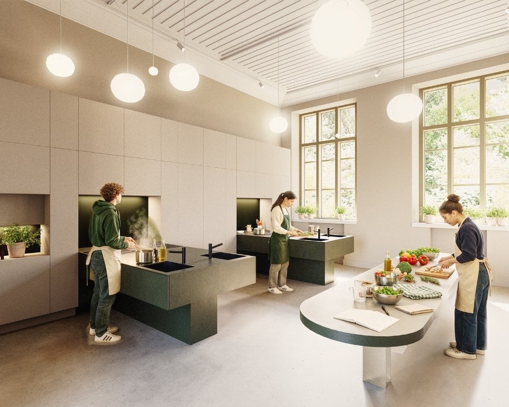 Utrustning: Fyra arbetsstationer, vanliga vitvaror, hushållsmaskiner, kärl och andra köksredskap. Rummet kan också användas som mötesrum.