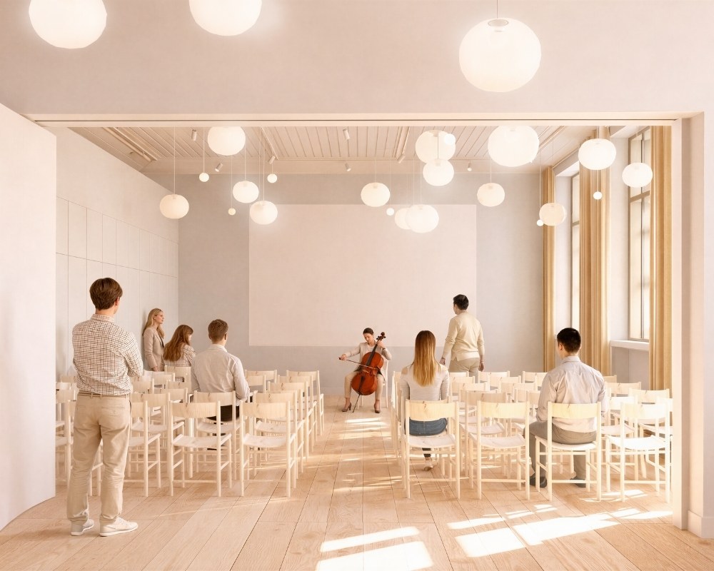 Utrustning: Flygel, olika instrument, två fasta kameror för enkel live streaming samt ett eget mixerbord för styrning av bild och ljud.